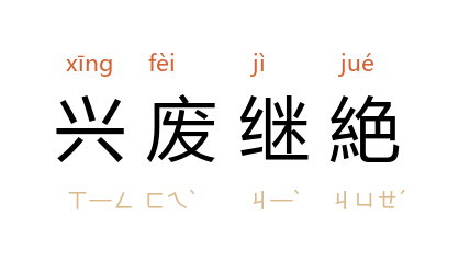 引《文选·班固·两都赋序》:「以兴废继绝,润色鸿业。」唐·独孤及〈舒州山谷寺觉寂塔隋故镜智禅师碑铭·序〉:「七年夏四月,上沛然降兴废继绝之诏,册谥禅师曰镜智。」