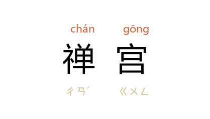 引唐 储光羲 《题虬上人房》诗:“禪宫分两地,释子一为心。”唐 王维 《夏日过青龙寺谒操禅师》诗:“龙钟一老翁,徐步謁禪宫。”朱德 《和叶剑英过五台山》:“禪宫寥落乱飞鸦,扫地出门罪佛也。”