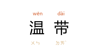 ⒈ 地球上界于热带及寒带间的地区。约在南北回归线各自延伸四十三度至极圈,即南、北纬六十六度半附近区域。气候温和,四季分明,故称为「温带」。有北温带、南温带之分。
