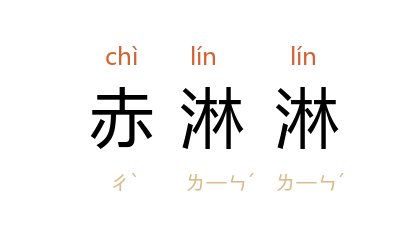 引《西游记》第十四回:“只见那猴早到了 三藏 马前,赤淋淋跪下道声:‘师父,我出来也!’”清 杨潮观 《贺兰山谪仙赠带》:“假若是赤淋淋御虎豺,假若是凛慄慓寄命托孤孩,要个擎天柱,摇他也不歪,磨他也不衰。”