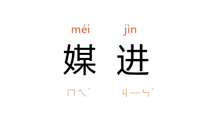引宋 周密 《齐东野语·谢惠国坐亡》:“﹝ 谢惠国 ﹞萃先帝宸翰为巨帙曰《宝奎録》,侑以自製丹砂、金器、古琴之类以进,当国者以为有意媒进。”《明史·赵志皋传》:“往日势重而权有所归,则相率附之以媒进;今日势轻而权有所分,则相率击之以博名。”清 钱谦益 《赠程穆倩序》:“处治不媒进,处乱不易方。”