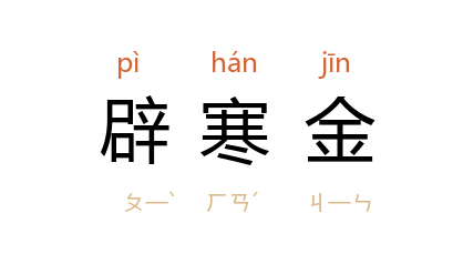 ⒈ 相传三国魏明帝时,昆明国进贡嗽金鸟,鸟吐金屑如粟。宫人争以鸟吐之金饰钗佩,谓之“辟寒金”。见晋王嘉《拾遗记·魏》。唐许浑《赠萧炼师》诗:“还磨照宝镜,犹插辟寒金。”宋李清照《浣溪沙》词:“瑞脑香消魂梦断,辟寒金小髻鬟松,醒时空对烛花红。”明陈与郊《昭君出塞》:“守宫砂点臂犹红,衬阶苔履痕空緑,辟寒金照腕徒黄。”一说,嗽金鸟居于避寒台,故鸟所吐之金谓之“辟寒金”。参阅南朝梁任昉《述异记》卷下。一说,鸟不畏寒,故称。见唐段成式《酉阳杂俎·羽篇》。