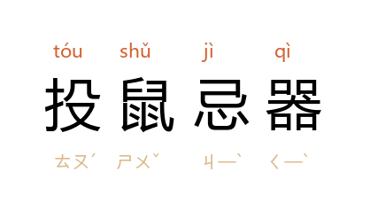 引语本 汉 贾谊 《治安策》:“里谚曰:‘欲投鼠而忌器。’此善諭也。鼠近於器,尚惮不投,恐伤其器,况於贵臣之近主乎!”
