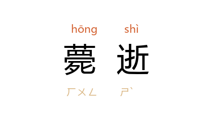 引清 袁枚 《随园诗话》卷八:“余己未同年,多出任封疆,内调鼎鼐者,可谓盛矣。近都薨逝,惟余以奉母故,空山独存。”欧阳予倩 《黛玉焚稿》第二场:“﹝ 贾政 ﹞还有一层难处,贵妃薨逝, 宝玉 应有九个月的功服,此时也难娶亲。”