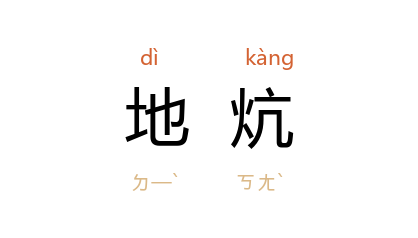 ⒈  北方有钱人家,往往在郎下掘一长方形的坑,坑内砌灶,火道分布各处,冷天灶内燃火,室中便异常温暖,称为「地炕」。