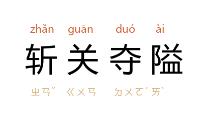 引刘伯承 《回顾长征》:“长征中,红军斩关夺隘,抢险飞渡,杀退了千万追兵阻敌。”许光达 等《湘鄂西和湘鄂川黔的武装斗争》:“﹝红三军﹞一路上克服了……严重困难,跋山涉水、斩关夺隘,粉碎了敌人的前堵后追,消灭许多敌人。”