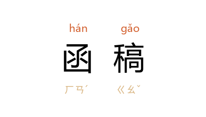 引清 冯桂芬 《皖水迎师记》:“继荐 太仓 钱主事 鼎铭,许之。且以函藳见属,辞,不获,稿成,授 钱君。”清 曾纪泽 《复陈中俄议界情形疏》:“除将致 俄 外部函稿译汉咨呈总理衙门查核外,谨将微臣遵旨与 俄国 外部商论界务情形,恭摺復陈。”清 曾纪泽 《伦敦致刘康侯太守》:“兹将復 丹崖星使 函稿寄弟一閲。”