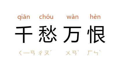 引明·陆采《怀香记·第二五出》:「受尽了千愁万恨废眠餐,挨至此夕偿心愿。」《红楼梦·第八九回》:「思前想后,竟应了前日梦中之谶,千愁万恨,堆上心来。」