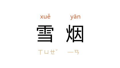 引陈其通 《万水千山》第六幕:“突然,雪崩爆发,炸起漫天雪烟。”王宗元 《高原·风雪·青春》:“卡车往下溜得更快了,车旁已经腾起一股雪烟。”乌兰巴干 《草原上的驯马姑娘》:“背后扬起的一阵雪烟,立刻遮蔽了她的身影。”
