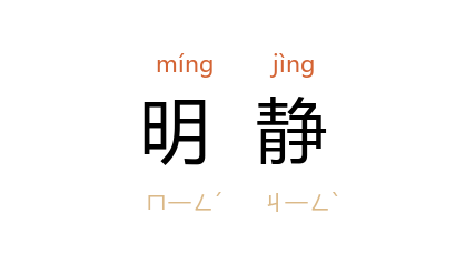 引艾芜 《海岛上》:“一早就给水门汀冰醒了,爬起来刚扣衣钮,屋外一望无际的淡蓝色海面和几只茶褐色风帆,便像壁间的大画幅一样,明静而清新地摆正我的眼前。”何永鰵 《戈壁滩上的探矿队》:“吴建文 带来一壶开水,早已喝光了,他正想向卫生员要,忽然前面隐隐约约的出现了一片明静的湖水。”
