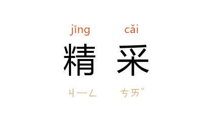 ⒈ 亦作“精彩”。精神;神采。犹文采。光辉。形容事物佳妙出色。