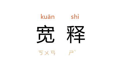 引《史记·五宗世家》:“景帝 少子,骄怠多淫,数犯禁,上常宽释之。”《资治通鉴·唐昭宗天复三年》:“鄩 曰:‘降将未受 梁王 宽释之命,安敢乘马衣裘乎!’乃素服乘驴至 大梁。”《东周列国志》第四二回:“叔武 得 晋侯 宽释之信,急发车骑如 陈,往迎 卫侯。”清 陈田 《明诗纪事辛籤·夏完淳》:“经略 洪承畴 欲宽释之,谬曰:‘童子何知,岂能称兵叛逆,误堕贼中耳。’”