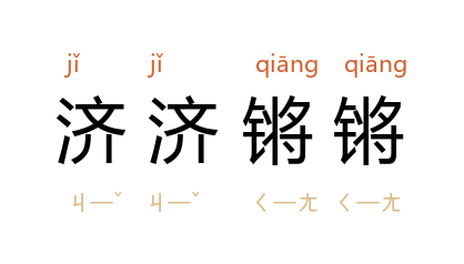 引汉 刘向 《说苑·建本》:“有昭辟雍,有贤泮宫,田里周行,济济鏘鏘而相从。”《平山冷燕》第一回:“一日,天子驾临早朝,文武百官济济鏘鏘,尽来朝贺,真个金闕晓鐘,玉阶仙仗,十分隆盛。”