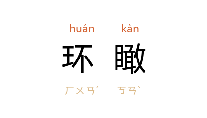 引康有为 《促南北速议和以应欧洲和局电》:“或谓外人环瞰,警告频来,不患南北之不和也。”梁启超 《呵旁观者文》:“以无一主人之国,而立於世界生存竞争最剧最烈、万鬼环瞰、百虎眈视之大舞臺,吾不知其如何而可也?”