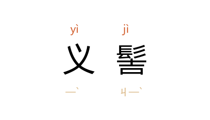 引《新唐书·五行志一》:“杨贵妃 常以假鬢为首饰,而好服黄裙。近服妖也。时人为之语曰:‘义髻抛河里,黄裙逐水流。’”宋 洪迈 《容斋随笔·人物以义为名》:“自外入而非正者曰义……衣裳器物亦然。在首曰义髻。”