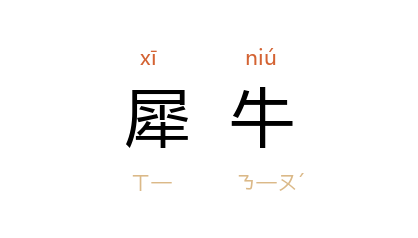 ⒈ 动物名。哺乳纲奇蹄目。身体笨拙,形状似牛,头略成三角形,颈短,鼻上有一或二个角,四肢粗大,每蹄有三趾,皮粗而厚,微黑色,全身几乎无毛。角可入药,亦可作武器。以草、树叶、嫩枝为食。产于亚洲与非洲的热带。