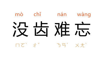 ⒈ 没齿,一辈子。没齿难忘指永远难以忘记。唐·李商隐〈为汝南公华州贺赦表〉:「司马谈阙陪盛礼,没齿难忘。」也作「没齿不忘」、「没齿难泯」、「没世不忘」、「没世难忘」、「没身不忘」。