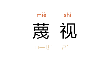 引宋 范公偁 《过庭录》:“曹蒙 衔命察访,蔑视郡县,威令甚严。”《明史·方从哲传》:“﹝ 从哲 ﹞纵子杀人,蔑视宪典,罪五。”鲁迅 《花边文学·过年》:“古 埃及 的奴隶们,有时也会冷然一笑。这是蔑视一切的笑。”