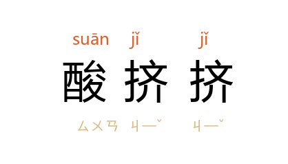 引《官场现形记》第六十回:“一羣小老婆似的,赛如就是抚臺一个是男人,大家都要讨他喜欢;稍些失点宠,就要酸挤挤的。”《官场现形记》第六十回:“他要委就委,他要撤就撤,全凭他一个人的主意。我们大人除掉照例画行之外,反不能问信。弄得他老人家心上亦有点酸挤挤的不高兴。”