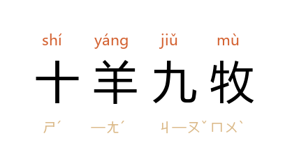 ⒈ 九个人放牧十只羊。比喻官员太多,政令不一,使别人不知所从(见于《隋书·杨尚希传》:“所谓民少官多,十羊九牧”;又唐·刘知几《史通·忤时》:“十羊九牧,其令难行”)