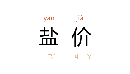 引《汉书·宣帝纪》:“盐,民之食,而贾咸贵,众庶重困,其减天下盐贾。”颜师古 注:“贾读曰价。”《新唐书·食货志四》:“青、楚、海、沧、棣、杭、苏 等州,以盐价市轻货,亦输司农。”唐 韩愈 《论变盐法事宜状》:“平叔 请定盐价,每斤三十文。”建南 《盐场》:“还有第四条,盐价须按市价增涨!”