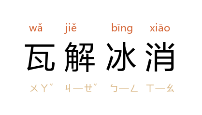 ⒈ 比喻崩溃、分裂或失败、离散、消失。也作「瓦解冰泮」。