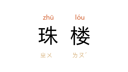引唐 于濆 《宫怨》诗:“临江起珠楼,不卖 文君 酒。”元 杨梓 《豫让吞炭》第三折:“更将玉殿珠楼、片瓦根椽直教火焚了罢。”清 纳兰性德 《柳枝词》:“软风吹雪带微香,曾向珠楼扫鈿床。”