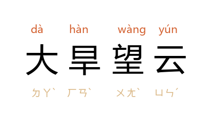 ⒈ 比喻渴望解除困境,如久旱盼望下雨一样。语本《孟子·梁惠王下》:“民望之,若大旱之望云霓也。”赵岐注:“霓,虹也。雨则虹见,故大旱而思见之。”