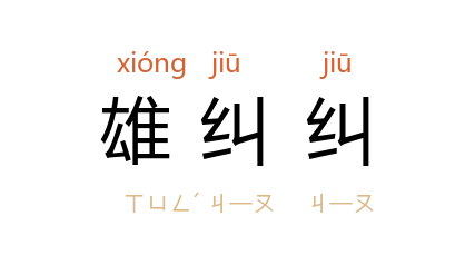 引元·孟汉卿《魔合罗·第三折》:「我索整顿了衣裳,正行中举目参详,见雄纠纠公人如虎狼,推拥著个得罪的婆娘。」《儿女英雄传·第六回》:「带一团冷森的杀气,雄纠纠气昂昂的一言不发,闯进房去。」