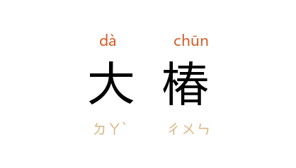 ⒈ 古寓言中的木名,以一万六千岁为一年。《庄子·逍遥游》:“上古有大椿者,以八千岁为春,以八千岁为秋。”陆德明释文引司马彪曰:“木,一名橓。橓,木槿也。”郭庆藩集释:“案《齐民要术》引司马云:木槿也,以万六千岁为一年。一名蕣椿。与《释文》所引小异。”后用以喻指父亲。