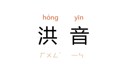 ⒈ 音韵学术语。发音时口腔共鸣空隙较大的音。 宋 元 等韵学家分韵母为开口、合口两类,每类又分一、二、三、四四等,一、二等都没有介音,发音时口腔共鸣空隙较大,故称洪音。自 明 清 等韵学家改开、合各四等为开、齐、合、撮四呼以后,也有人称开口呼为开口洪音,齐齿呼为开口细音,合口呼为合口洪音,撮口呼为合口细音。
