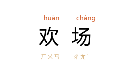 引清 黄景仁 《春夜杂咏》之十二:“落月归幽斋,欢场一思遍。”清 黄景仁 《发颍州》诗:“欢场知有散,当散戚不忺。”《儿女英雄传》第二十回:“这 青云山 分明是凄惨惨的几间风冷茅檐,怎的霎时间变作了暖溶溶的春生画阁?都只道是这般人第一个欢场,那知恰是这评话里第二番结束。”