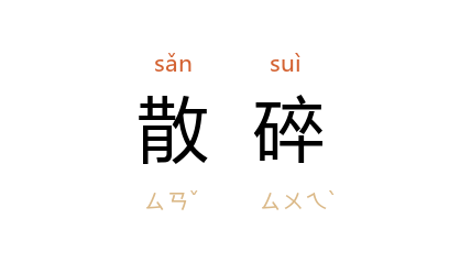 引《水浒传》第一〇二回:“牛大户 向身边取出一包散碎银两,递与 王庆。”《初刻拍案惊奇》卷一:“手头用来用去的,只是那散碎银子。”艾芜 《乌鸦之歌》:“一地浓黑的树影,配着从叶间漏下来的散碎月光。”