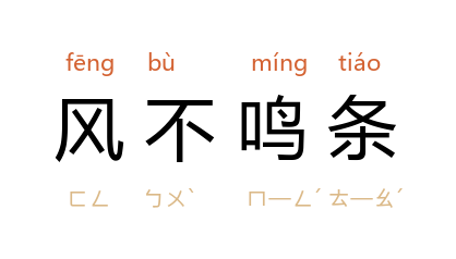 ⒈ 和风轻拂,树枝不发出声响。古人认为是贤者在位,天下大治时出现的一种自然景象。汉桓宽《盐铁论·水旱》:“周公载纪而天下太平,国无夭伤,岁无荒年。当此之时,雨不破块,风不鸣条。”汉王充《论衡·是应》:“儒者论太平瑞应,皆言气物卓异……关梁不闭,道无虏掠,风不鸣条,雨不破块,五日一风,十日一雨。”后因以“风不鸣条”比喻社会安定,世事太平。