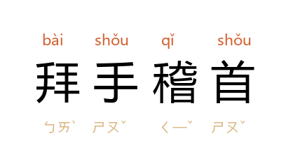 ⒈ 拜手:作揖;稽首:古时的一种跪拜礼,叩头至地,是九拜中最恭敬的。用于书信向对方表示敬意。