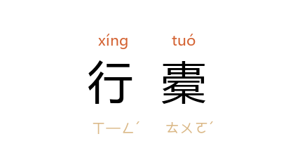 引《新五代史·杂传·张籛》:“魏王 继岌 死 渭南,籛 悉取其行橐。”宋 梅尧臣 《次韵答德化尉郭功甫遂以送之》:“袖携一卷诗,行槖更无长。”金 元好问 《不寐》诗:“日月虚行槖,风霜入敝裘。”清 王士禛 《池北偶谈·谈异七·女侠》:“晚将宿逆旅,主人辞焉,且言镇西北不里许,有尼菴,凡有行槖者,皆往投宿,因导之往。”