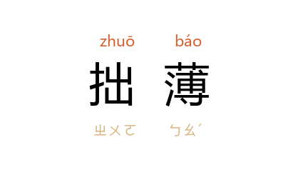 引南朝 梁 何逊 《临行公车》诗:“道胜多增荣,拙薄终难化。”唐 李白 《答从弟幼成过西园见赠》诗:“拙薄谢明时,栖闭归故园。”唐 白居易 《新昌新居书事四十韵》:“拙薄才无取,疎庸职不专。”