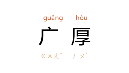 引《礼记·中庸》:“今夫地,一撮土之多,及其广厚,载 华岳 而不重,振河海而不洩,万物载焉。”唐 韩愈 《上巳日燕太学听弹琴诗序》:“优游夷愉,广厚高明,迫三代之遗音。”元 郝经 《浑元刘先生哀辞》序:“其辞汪洋焕烂,高壮广厚,约而不缺,肆而不繁。”