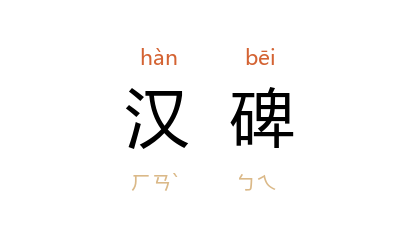 ⒈ 汉代碑刻。碑文字体以隶为主,碑额文字多用篆书。汉碑(包括拓本)流传甚多,著名的有《麃孝禹碑》、《华山庙碑》、《礼器碑》、《史晨碑》、《曹全碑》等。