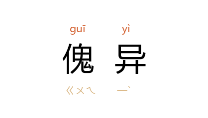 引《周礼·春官·大司乐》:“凡日月食,四镇五岳崩,大傀异烖,诸侯薨,令去乐。”郑玄 注:“傀犹怪也。大怪异烖,谓天地奇变,若星辰奔霣,及震裂为害者。”清 李斗 《扬州画舫录·草河录下》:“﹝ 曾曰唯 ﹞不苟合於世……客有遗貂裘者,剪碎以二葛表里纫之,其傀异如此。”