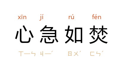 引《二十年目睹之怪现状·第一七回》:「他查了一查,说道:『要等三四天。』我越发觉得心急如焚,然而也是没法的事。」