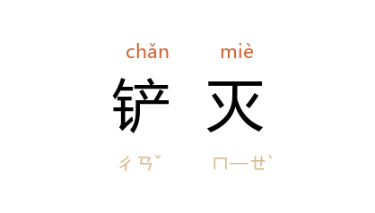 引章炳麟 《秦献记》:“商君 以《诗》、《书》、《礼》、《乐》为‘六虱’(《靳令篇》),欲尽铲灭之,而以法家相 秦 者宗其术。”铲除;消灭。 胡也频 《到莫斯科去》十八:“她觉得她应该去做整个剷灭这一伙人的工作。”