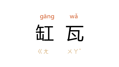 ⒈ 用砂子、陶土等混合而成的一种质料,制成器物时外面多涂上釉,缸、缸盆等就是用缸瓦制造的。