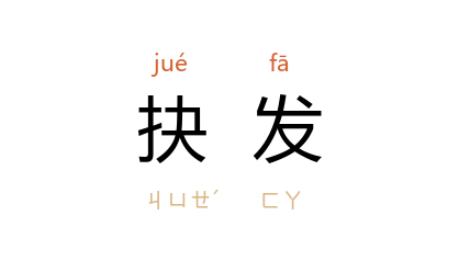 引明 方孝孺 《答许廷慎》:“足下幸安适无所苦而駸駸焉,欲抉发奇秘以与造化争也。”《<捻军史料丛刊>序言》:“研究捻军的活动历史在现在只有从 清 朝方面去抉发搜罗--从反面去推寻真相。”郭沫若 《十批判书·古代研究的自我批判》:“卜辞研究要感谢 王国维,是他……抉发了三千年来所久被埋没的秘密。”