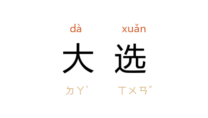 ⒉ 今称上自总统、民意代表,下至地方首长,由全民普选,称为「大选」。