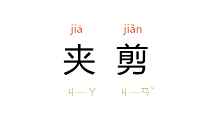 引《红楼梦·第五一回》:「那是五两的锭子夹了半个,这一块至少还有二两呢!这会子又没夹剪,姑娘收了这个,再拣一块小些的罢。」