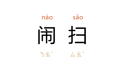 引唐 张氏女 《梦王尚书口授吟》:“鬟梳闹扫学宫妆,独立闲庭纳夜凉。”明 王志坚 《表异录·士庶》:“闹埽,髻名。”清 王丹林 《银塘曲》诗:“团扇承恩夏日长,晚装闹扫追微凉。”