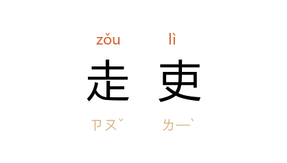 引唐 司空曙 《寄卫明府》诗:“高僧静望山僮逐,走吏喧来水鸭沉。”唐 赵璘 《因话录·商下》:“中丞使府,自有宾僚,某走吏也,安得同之?”《续资治通鉴·宋太宗至道元年》:“有 郑昌嗣 者,亦起三司走吏。”