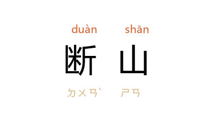 引南朝 宋 刘义庆 《世说新语·赏誉》:“世目 周侯,嶷如断山。”南朝 梁 江淹 《江上之山赋》:“悵日暮兮吾有念,临江上之断山。”唐 杜甫 《远游》诗:“江阔浮高栋,云长出断山。”明 文徵明 《题画》诗:“冰禽飞去疎烟灭,目送秋光入断山。”