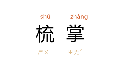 引北魏 贾思勰 《齐民要术·笔法》:“韦仲将 《笔方》曰:先次以铁梳梳兔毫及羊青毛,去其秽毛,盖使不髯。茹讫,各别之。皆用梳掌痛拍整齐毫锋端,本各作扁,极令均调平好用。”缪启愉 校释:“梳掌,梳齿下部拿梳的地方,即梳把。”唐 白居易 《和梦游春诗一百韵》:“裙腰银綫压,梳掌金筐蹙。”